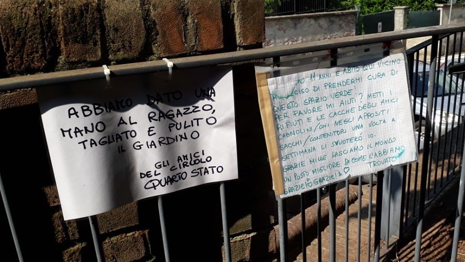 In questi giorni abbiamo trovato un messaggio all’ingresso dei Giardini: un ragazzo di undici anni si offriva di portare via settimanalmente il sacco dell’immondizia presente all’interno del parchetto. Un bel gesto di altruismo e senso civico. Da un po’ di tempo anche noi stavamo pensando a come “adottare” i Giardini della Costituzione e il messaggio del giovane è stato una molla in più.